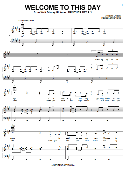 Download or print Melissa Etheridge Welcome To This Day sheet music, chords and digital score arranged for Piano, Vocal & Guitar Chords (Right-Hand Melody). This Children score includes 5 page(s).