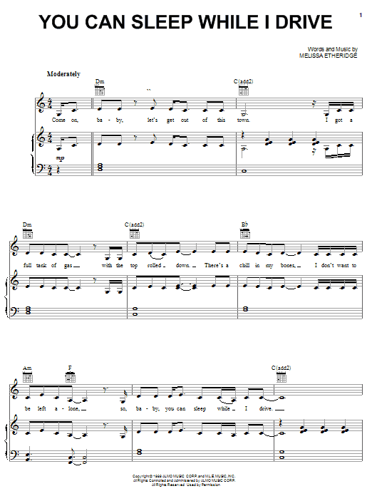 Download or print Melissa Etheridge You Can Sleep While I Drive sheet music, chords and digital score arranged for Piano, Vocal & Guitar Chords (Right-Hand Melody). This Pop score includes 5 page(s).