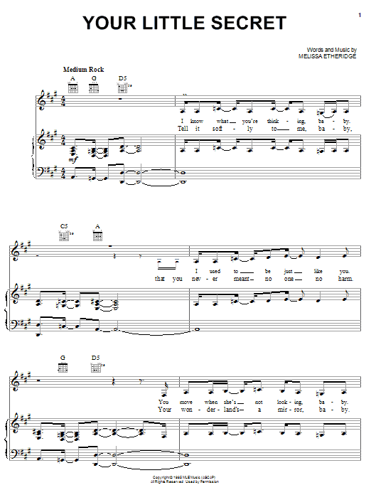 Download or print Melissa Etheridge Your Little Secret sheet music, chords and digital score arranged for Guitar Tab. This Pop score includes 7 page(s).