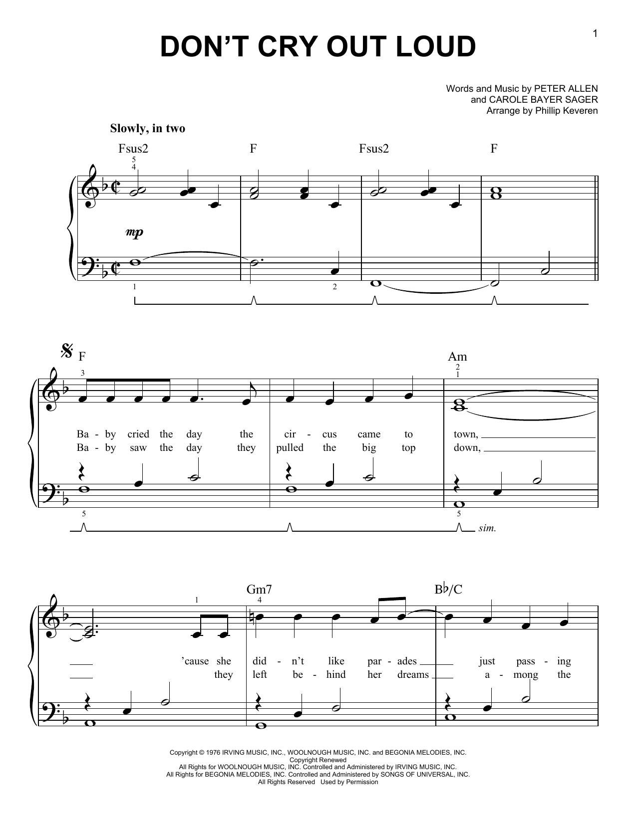 Download or print Melissa Manchester Don't Cry Out Loud (We Don't Cry Out Loud) (arr. Phillip Keveren) sheet music, chords and digital score arranged for Easy Piano. This Pop score includes 5 page(s).