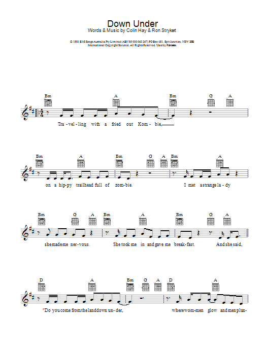 Download or print Men At Work Down Under sheet music, chords and digital score arranged for Trombone Solo. This Pop score includes 2 page(s).