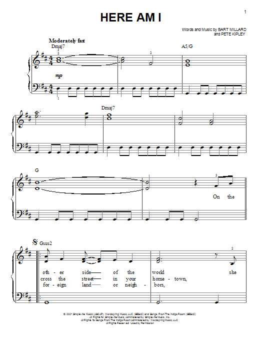 Download or print MercyMe Here Am I sheet music, chords and digital score arranged for Easy Piano. This Christian score includes 8 page(s).