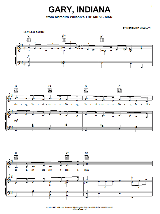 Download or print Meredith Willson Gary, Indiana sheet music, chords and digital score arranged for Piano, Vocal & Guitar Chords (Right-Hand Melody). This Children score includes 4 page(s).