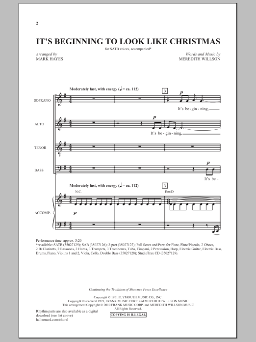 Download or print Meredith Willson It's Beginning To Look Like Christmas (arr. Mark Hayes) sheet music, chords and digital score arranged for SSAA Choir. This Christmas score includes 15 page(s).
