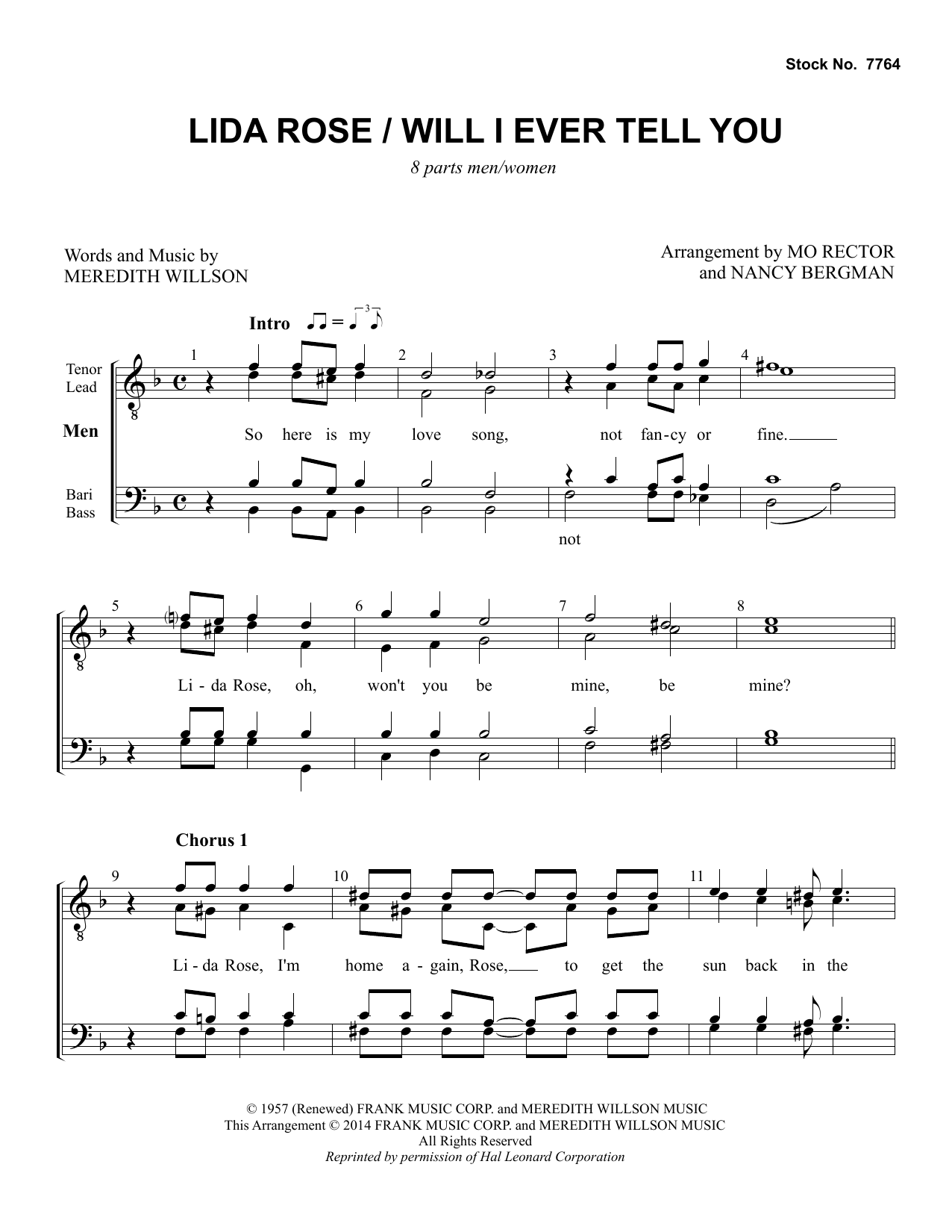 Download or print Meredith Willson Lida Rose/Will I Ever Tell You (from The Music Man) (arr. Nancy Bergman, Mo Rector) sheet music, chords and digital score arranged for Choir. This Barbershop score includes 10 page(s).