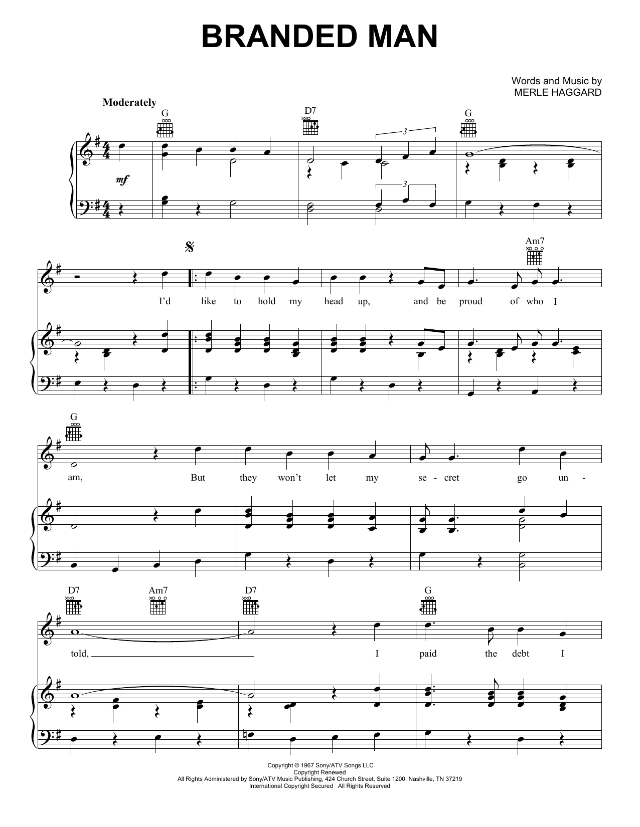 Download or print Merle Haggard Branded Man sheet music, chords and digital score arranged for Piano, Vocal & Guitar Chords (Right-Hand Melody). This Country score includes 3 page(s).