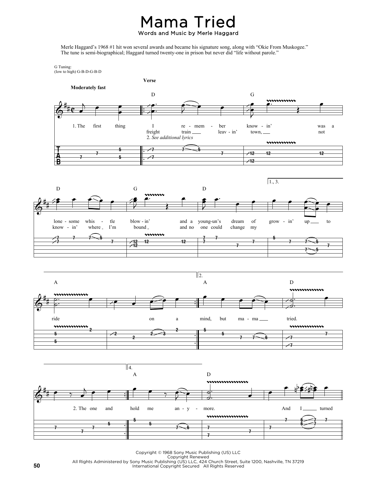 Download or print Merle Haggard Mama Tried (arr. Fred Sokolow) sheet music, chords and digital score arranged for Guitar Tab. This Country score includes 2 page(s).