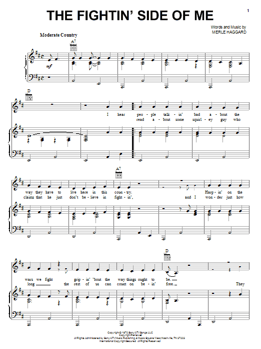 Download or print Merle Haggard The Fightin' Side Of Me sheet music, chords and digital score arranged for Piano, Vocal & Guitar Chords (Right-Hand Melody). This Country score includes 3 page(s).