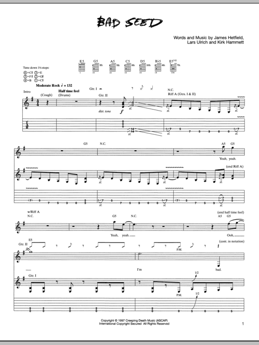 Download or print Metallica Bad Seed sheet music, chords and digital score arranged for Guitar Tab. This Pop score includes 9 page(s).