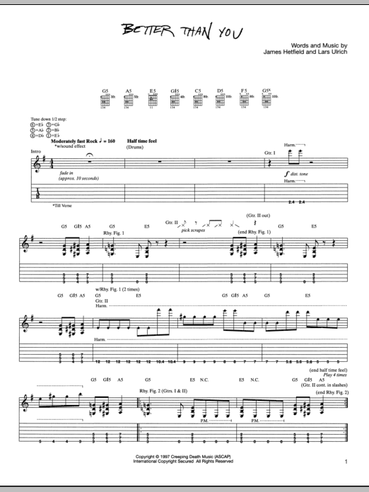 Download or print Metallica Better Than You sheet music, chords and digital score arranged for Guitar Tab. This Pop score includes 12 page(s).
