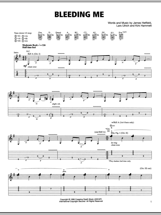 Download or print Metallica Bleeding Me sheet music, chords and digital score arranged for Guitar Tab. This Metal score includes 12 page(s).