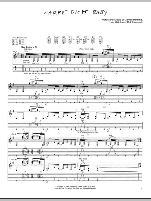 Download or print Metallica Carpe Diem Baby sheet music, chords and digital score arranged for Bass Guitar Tab. This Pop score includes 8 page(s).