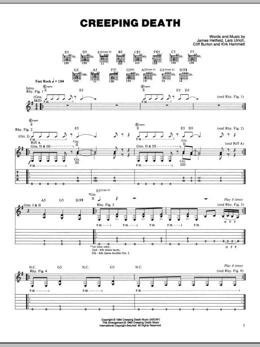 Download or print Metallica Creeping Death sheet music, chords and digital score arranged for Bass Guitar Tab. This Pop score includes 5 page(s).