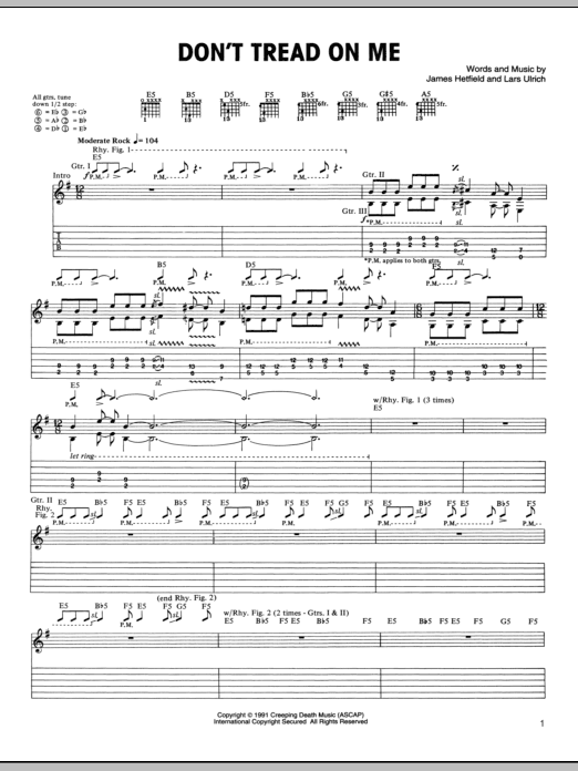 Download or print Metallica Don't Tread On Me sheet music, chords and digital score arranged for Guitar Tab. This Pop score includes 5 page(s).