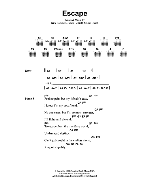 Download or print Metallica Escape sheet music, chords and digital score arranged for Bass Guitar Tab. This Pop score includes 4 page(s).