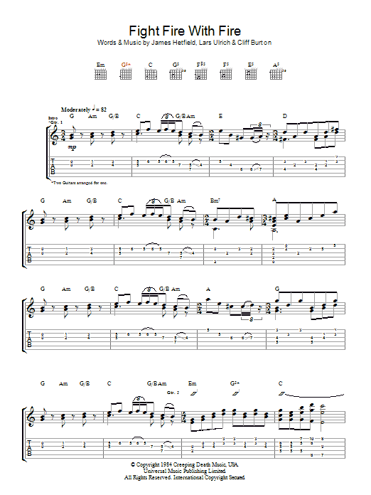 Download or print Metallica Fight Fire With Fire sheet music, chords and digital score arranged for Guitar Chords/Lyrics. This Metal score includes 3 page(s).