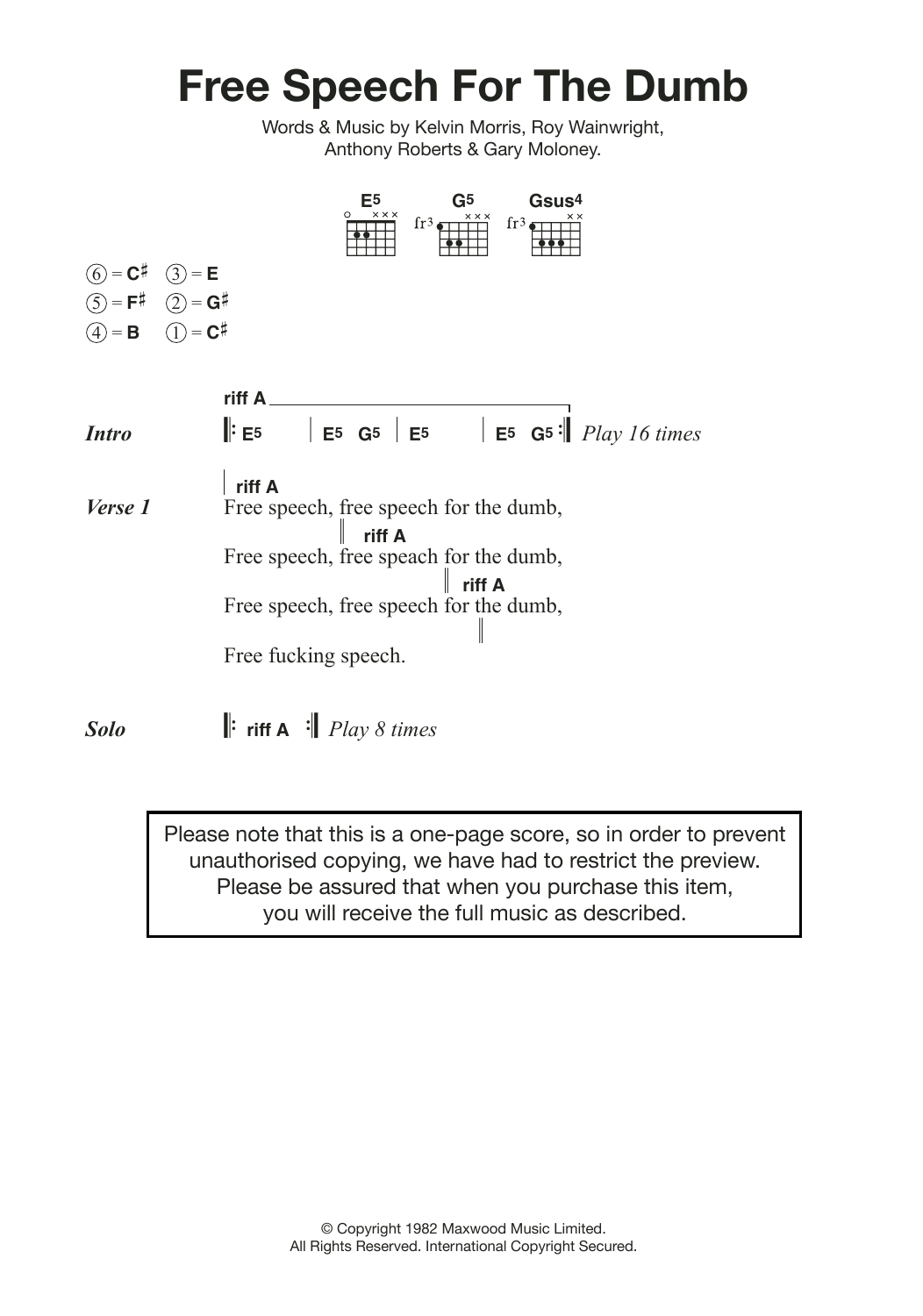 Download or print Metallica Free Speech For The Dumb sheet music, chords and digital score arranged for Guitar Chords/Lyrics. This Rock score includes 2 page(s).