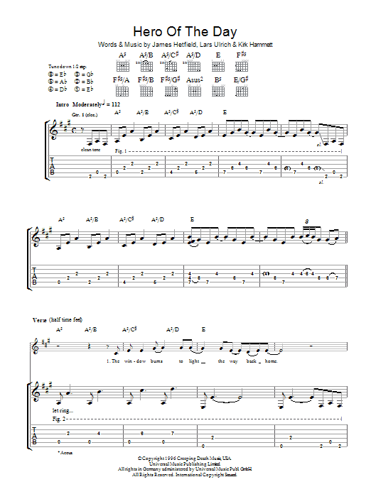 Download or print Metallica Hero Of The Day sheet music, chords and digital score arranged for Guitar Tab. This Metal score includes 13 page(s).