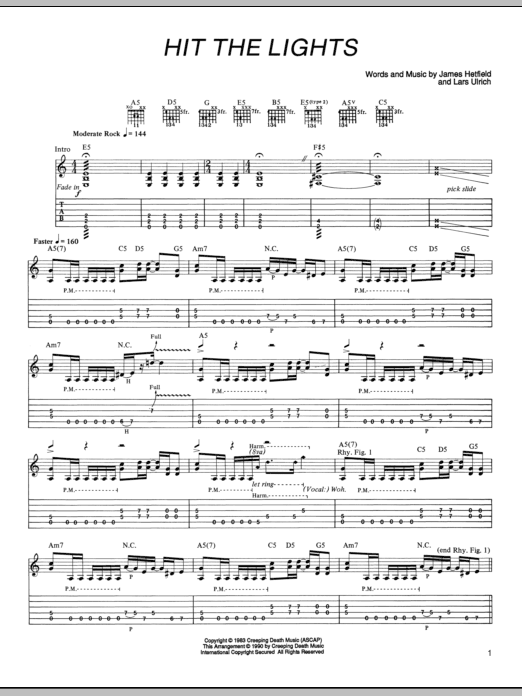 Download or print Metallica Hit The Lights sheet music, chords and digital score arranged for Guitar Tab. This Pop score includes 7 page(s).