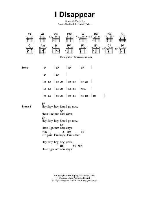 Download or print Metallica I Disappear sheet music, chords and digital score arranged for Guitar Tab. This Metal score includes 14 page(s).