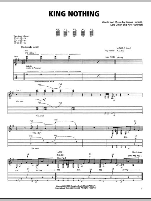 Download or print Metallica King Nothing sheet music, chords and digital score arranged for Guitar Tab (Single Guitar). This Metal score includes 11 page(s).