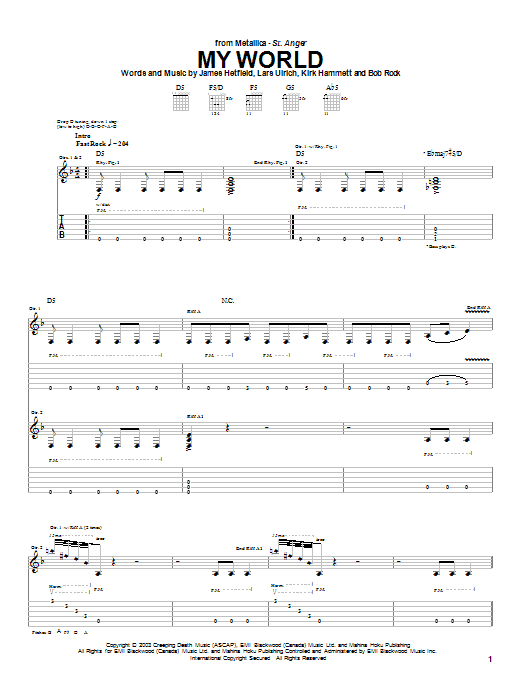 Download or print Metallica My World sheet music, chords and digital score arranged for Guitar Chords/Lyrics. This Metal score includes 4 page(s).