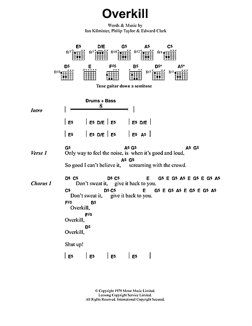 Download or print Metallica Overkill sheet music, chords and digital score arranged for Guitar Tab. This Pop score includes 10 page(s).