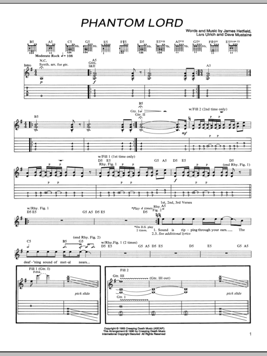 Download or print Metallica Phantom Lord sheet music, chords and digital score arranged for Guitar Tab. This Pop score includes 5 page(s).