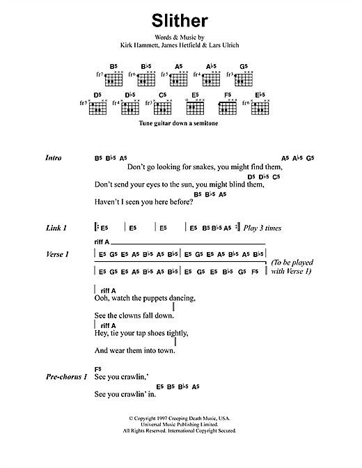 Download or print Metallica Slither sheet music, chords and digital score arranged for Guitar Tab. This Pop score includes 13 page(s).