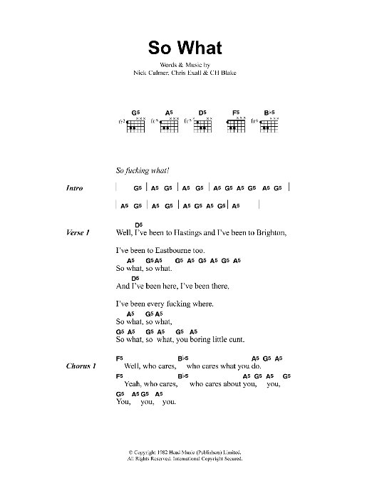 Download or print Metallica So What sheet music, chords and digital score arranged for Guitar Chords/Lyrics. This Metal score includes 3 page(s).