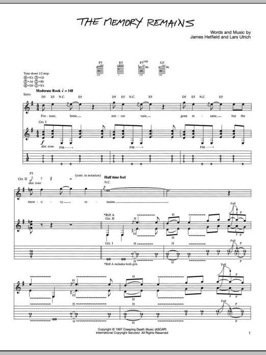 Download or print Metallica The Memory Remains sheet music, chords and digital score arranged for Guitar Tab. This Metal score includes 12 page(s).