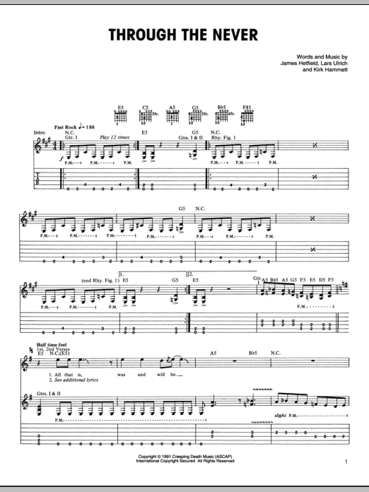 Download or print Metallica Through The Never sheet music, chords and digital score arranged for Guitar Chords/Lyrics. This Metal score includes 3 page(s).