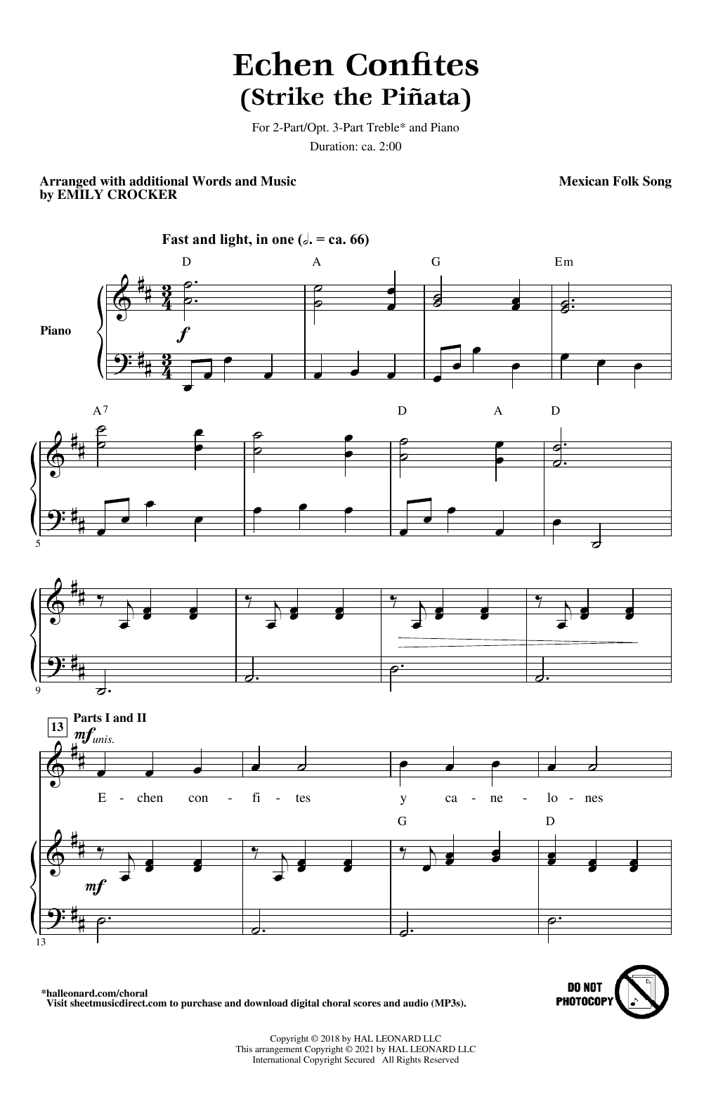 Download or print Mexican Folk Song Echen Confites (Strike the Piñata) (arr. Emily Crocker) sheet music, chords and digital score arranged for 2-Part Choir, 3-Part Mixed Choir. This Children score includes 11 page(s).