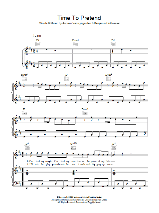 Download or print MGMT Time To Pretend sheet music, chords and digital score arranged for Guitar Chords/Lyrics. This Rock score includes 3 page(s).