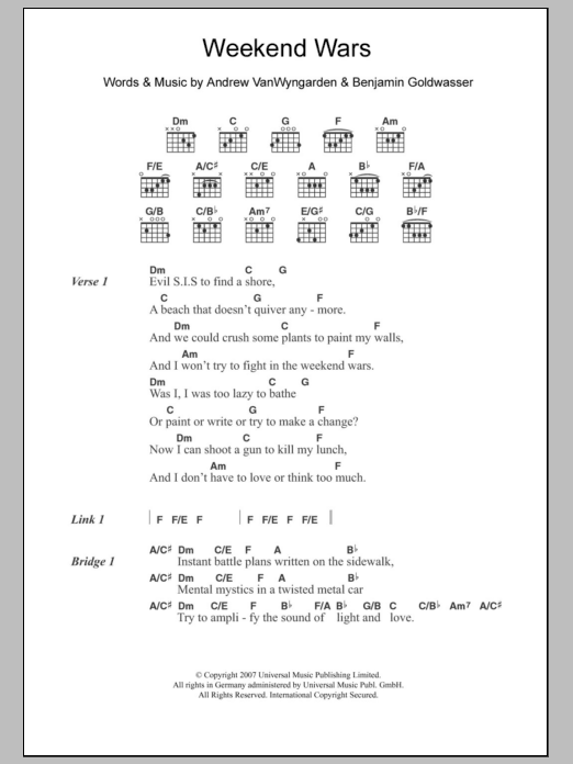 Download or print MGMT Weekend Wars sheet music, chords and digital score arranged for Guitar Chords/Lyrics. This Rock score includes 2 page(s).
