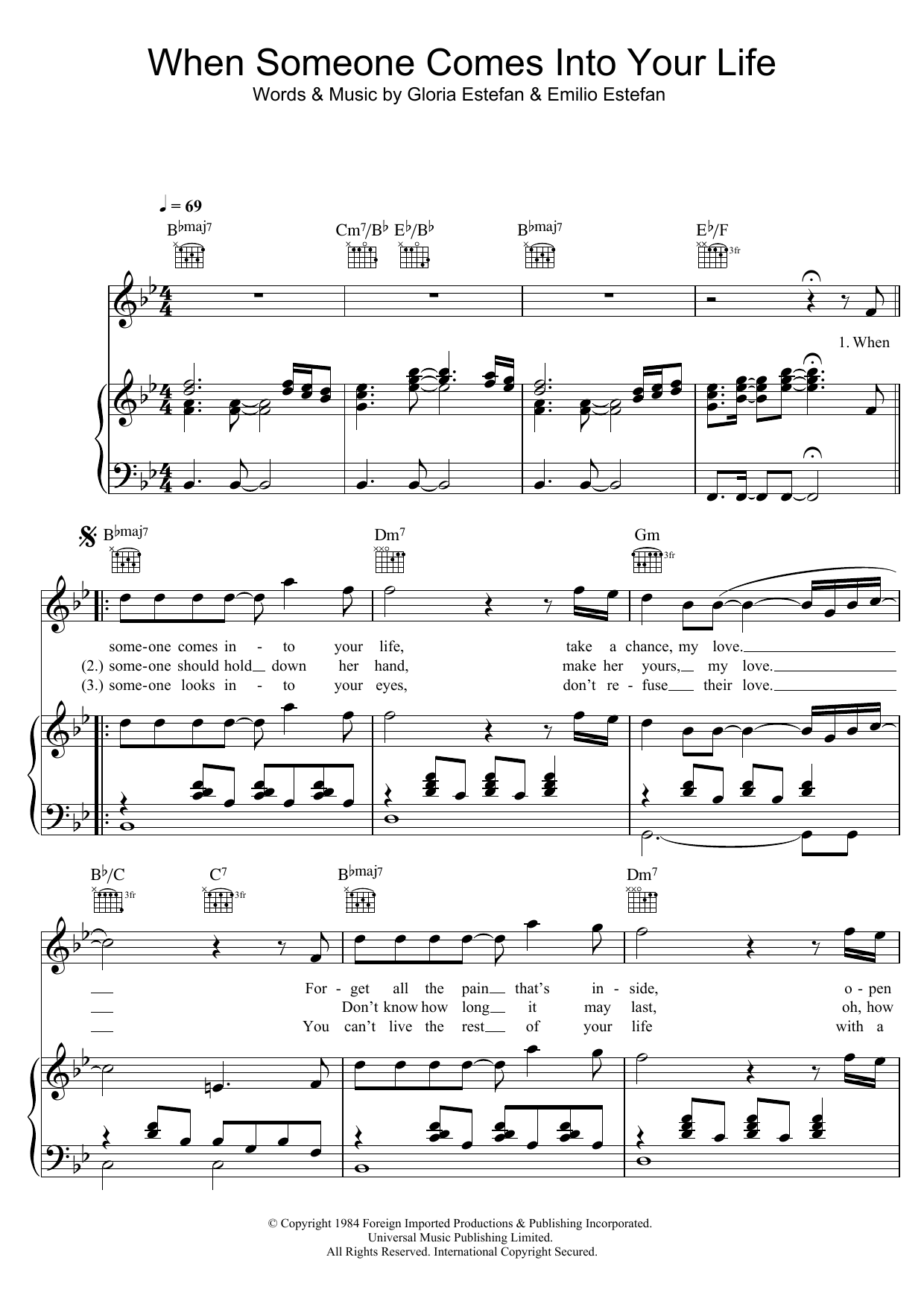 Download or print Miami Sound Machine When Someone Comes Into Your Life sheet music, chords and digital score arranged for Piano, Vocal & Guitar Chords. This Pop score includes 4 page(s).