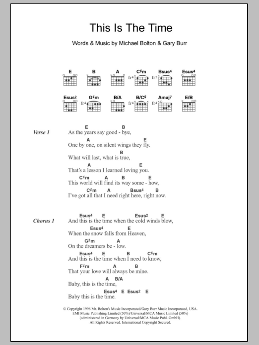 Download or print Michael Bolton This Is The Time sheet music, chords and digital score arranged for Guitar Chords/Lyrics. This Pop score includes 3 page(s).