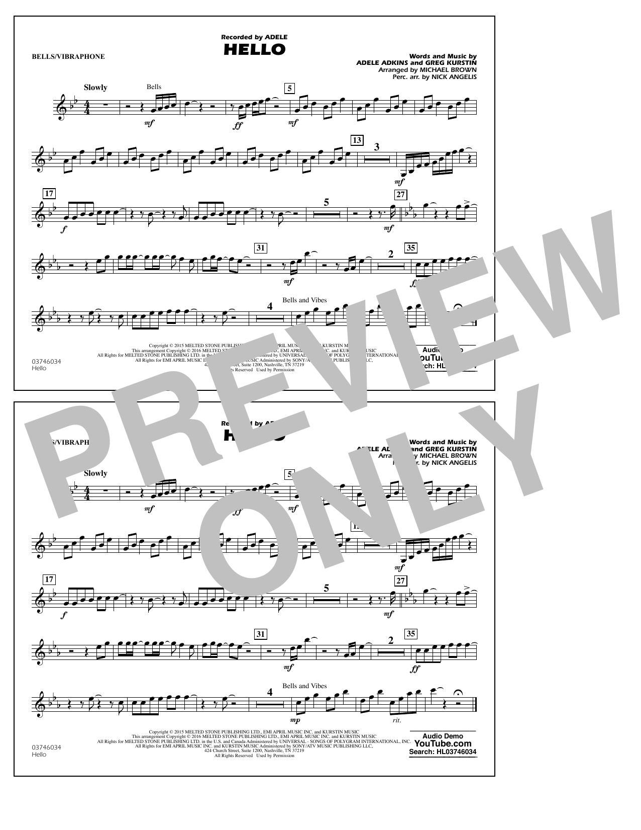 Download or print Michael Brown Hello - Bells/Vibes sheet music, chords and digital score arranged for Marching Band. This Pop score includes 1 page(s).