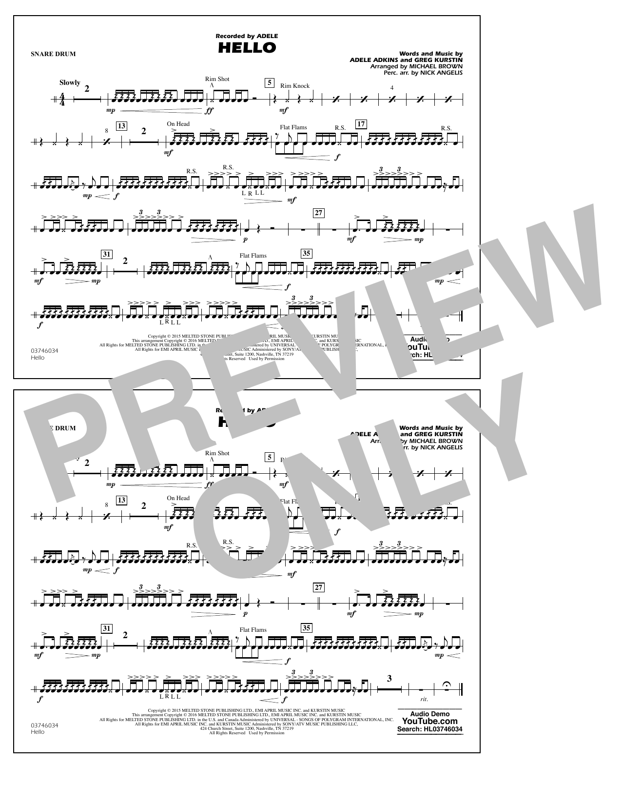 Download or print Michael Brown Hello - Snare Drum sheet music, chords and digital score arranged for Marching Band. This Pop score includes 1 page(s).