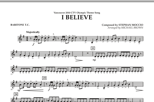 Download or print Michael Brown I Believe (Vancouver 2010 CTV Olympic Theme Song) - Baritone T.C. sheet music, chords and digital score arranged for Concert Band. This Olympics score includes 1 page(s).