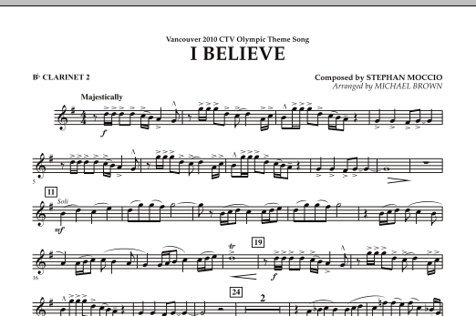 Download or print Michael Brown I Believe (Vancouver 2010 CTV Olympic Theme Song) - Bb Clarinet 2 sheet music, chords and digital score arranged for Concert Band. This Olympics score includes 1 page(s).