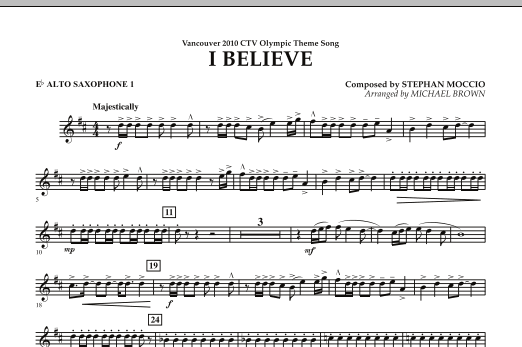 Download or print Michael Brown I Believe (Vancouver 2010 CTV Olympic Theme Song) - Eb Alto Saxophone 1 sheet music, chords and digital score arranged for Concert Band. This Olympics score includes 1 page(s).
