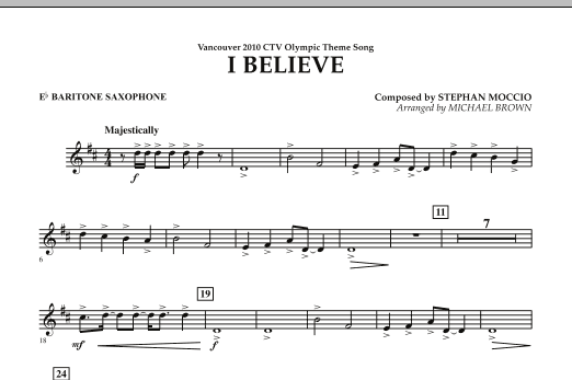 Download or print Michael Brown I Believe (Vancouver 2010 CTV Olympic Theme Song) - Eb Baritone Saxophone sheet music, chords and digital score arranged for Concert Band. This Olympics score includes 1 page(s).