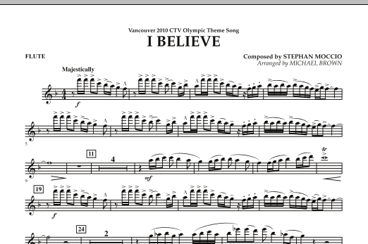 Download or print Michael Brown I Believe (Vancouver 2010 CTV Olympic Theme Song) - Flute sheet music, chords and digital score arranged for Concert Band. This Olympics score includes 1 page(s).