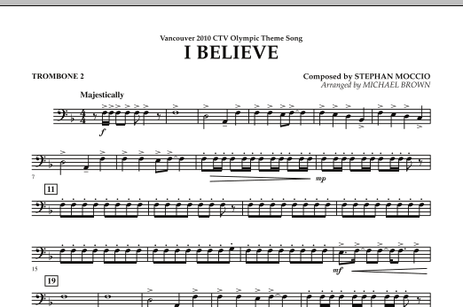 Download or print Michael Brown I Believe (Vancouver 2010 CTV Olympic Theme Song) - Trombone 2 sheet music, chords and digital score arranged for Concert Band. This Olympics score includes 1 page(s).