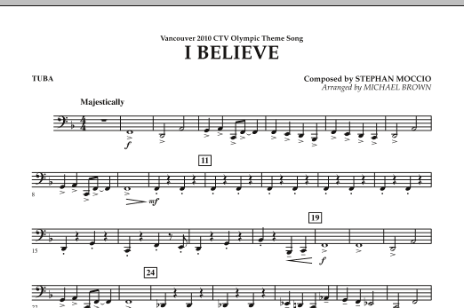 Download or print Michael Brown I Believe (Vancouver 2010 CTV Olympic Theme Song) - Tuba sheet music, chords and digital score arranged for Concert Band. This Olympics score includes 1 page(s).