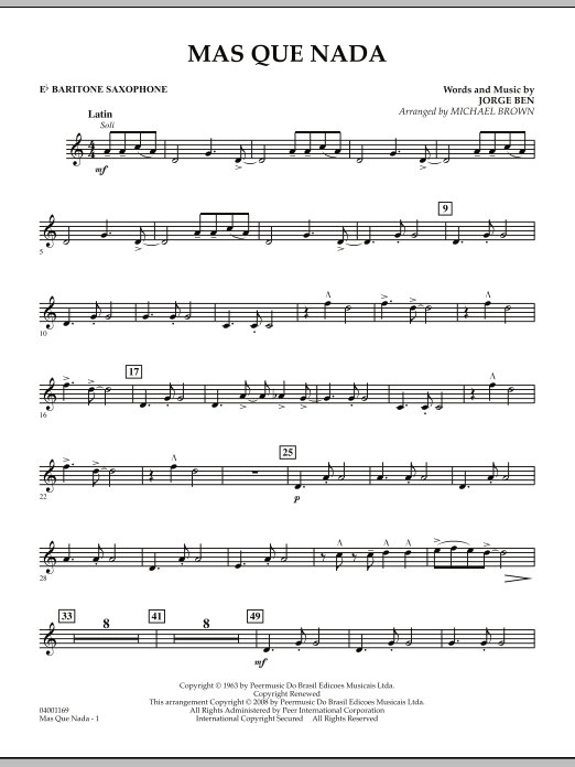 Download or print Michael Brown Mas Que Nada - Eb Baritone Saxophone sheet music, chords and digital score arranged for Concert Band. This Latin score includes 2 page(s).