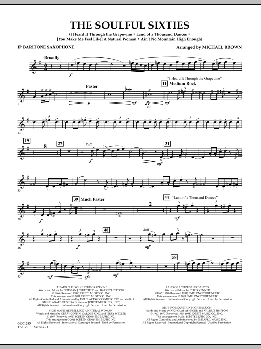 Download or print Michael Brown The Soulful Sixties - Eb Baritone Saxophone sheet music, chords and digital score arranged for Concert Band. This Pop score includes 2 page(s).