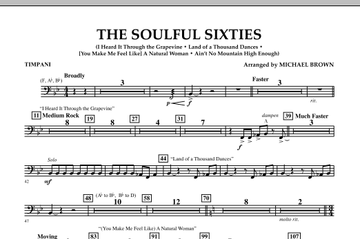 Download or print Michael Brown The Soulful Sixties - Timpani sheet music, chords and digital score arranged for Concert Band. This Pop score includes 1 page(s).