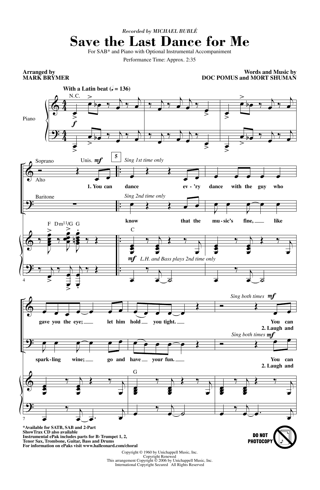 Download or print Michael Buble Save The Last Dance For Me (arr. Mark Brymer) sheet music, chords and digital score arranged for SAB Choir. This Pop score includes 7 page(s).